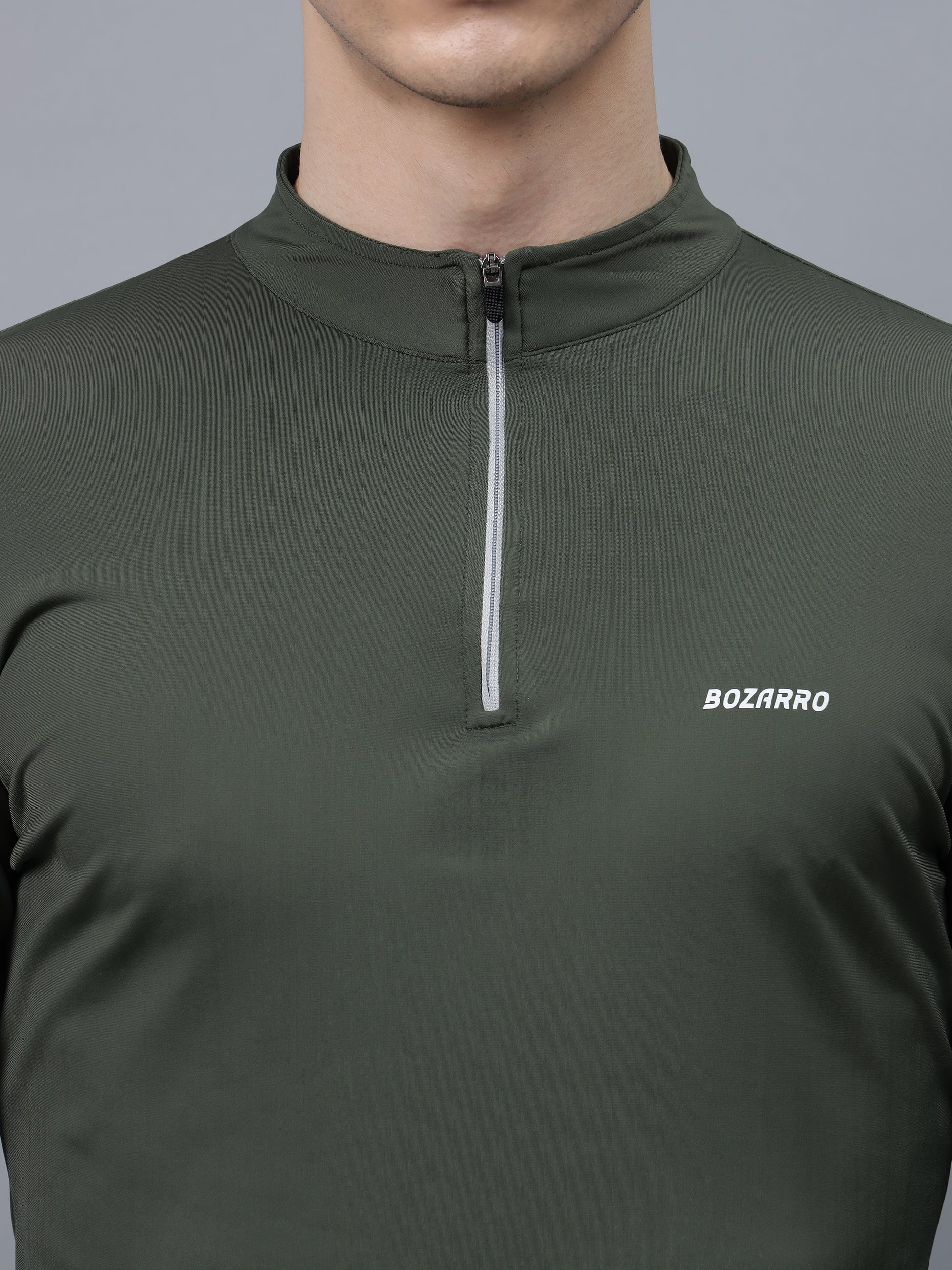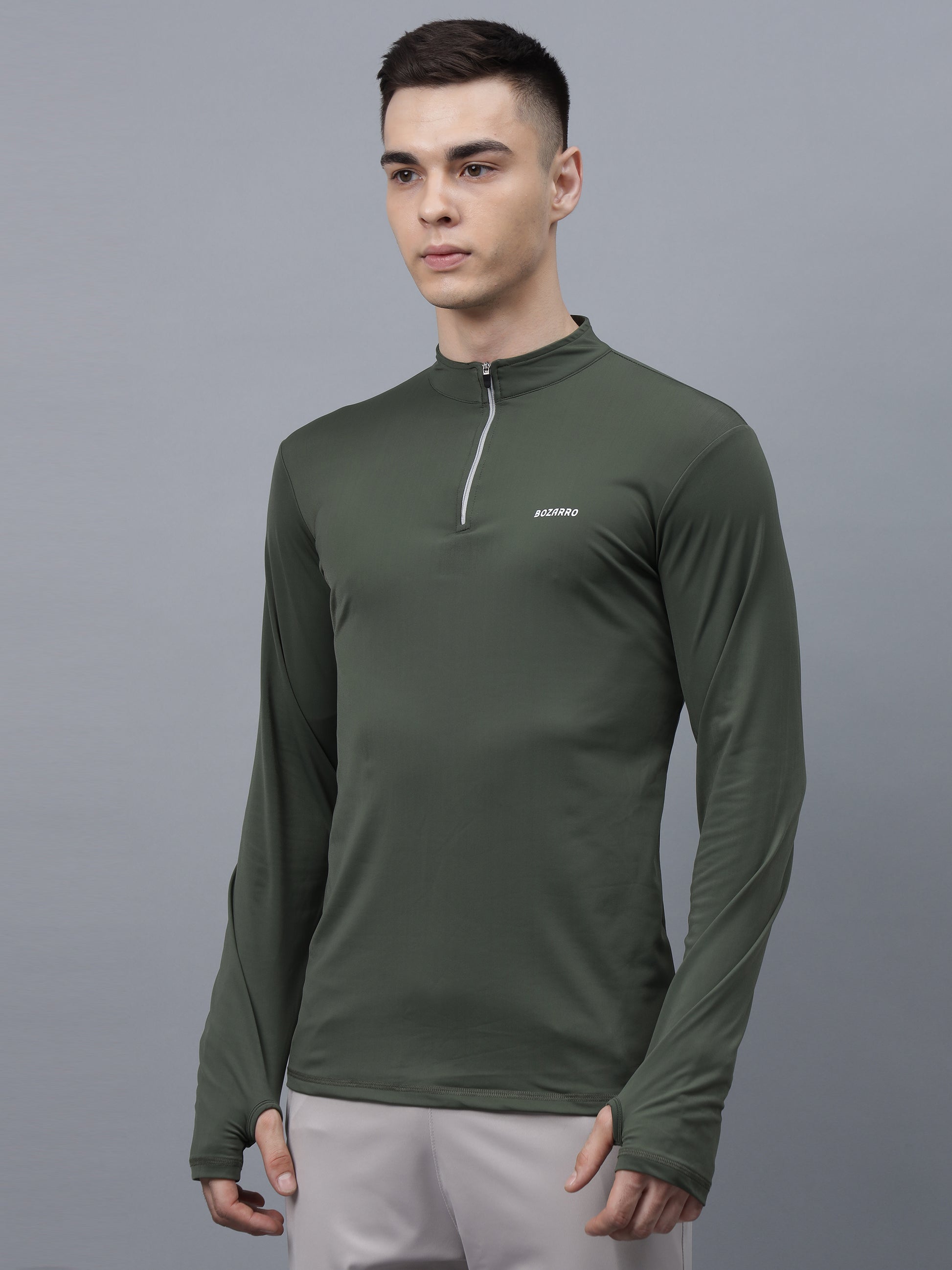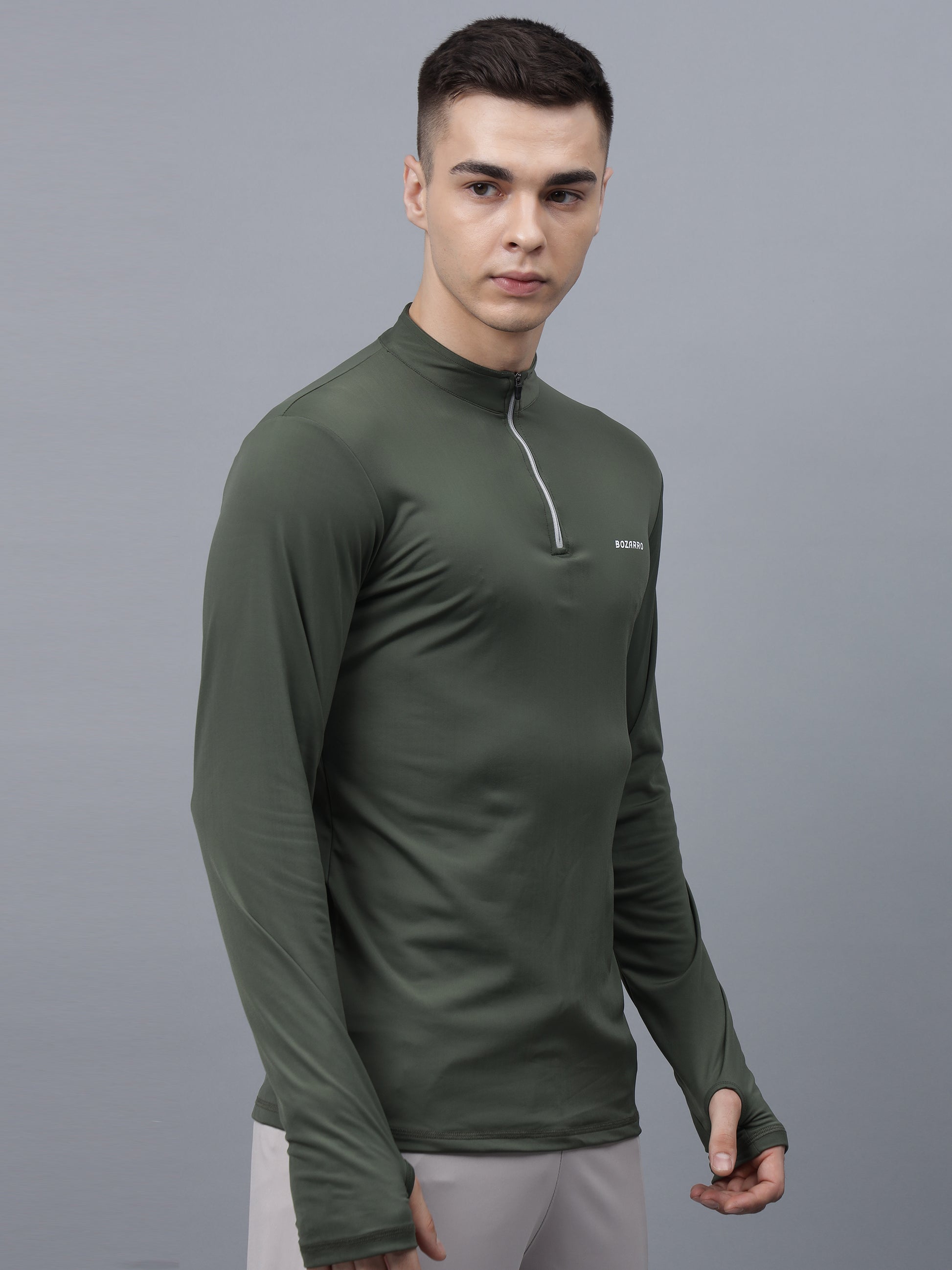 Men's Thumbhole Round Neck Full Sleeve T-Shirt |Half-Zipper Closure | Men's Basic Activewear T-Shirt for Mens-Olive Green
