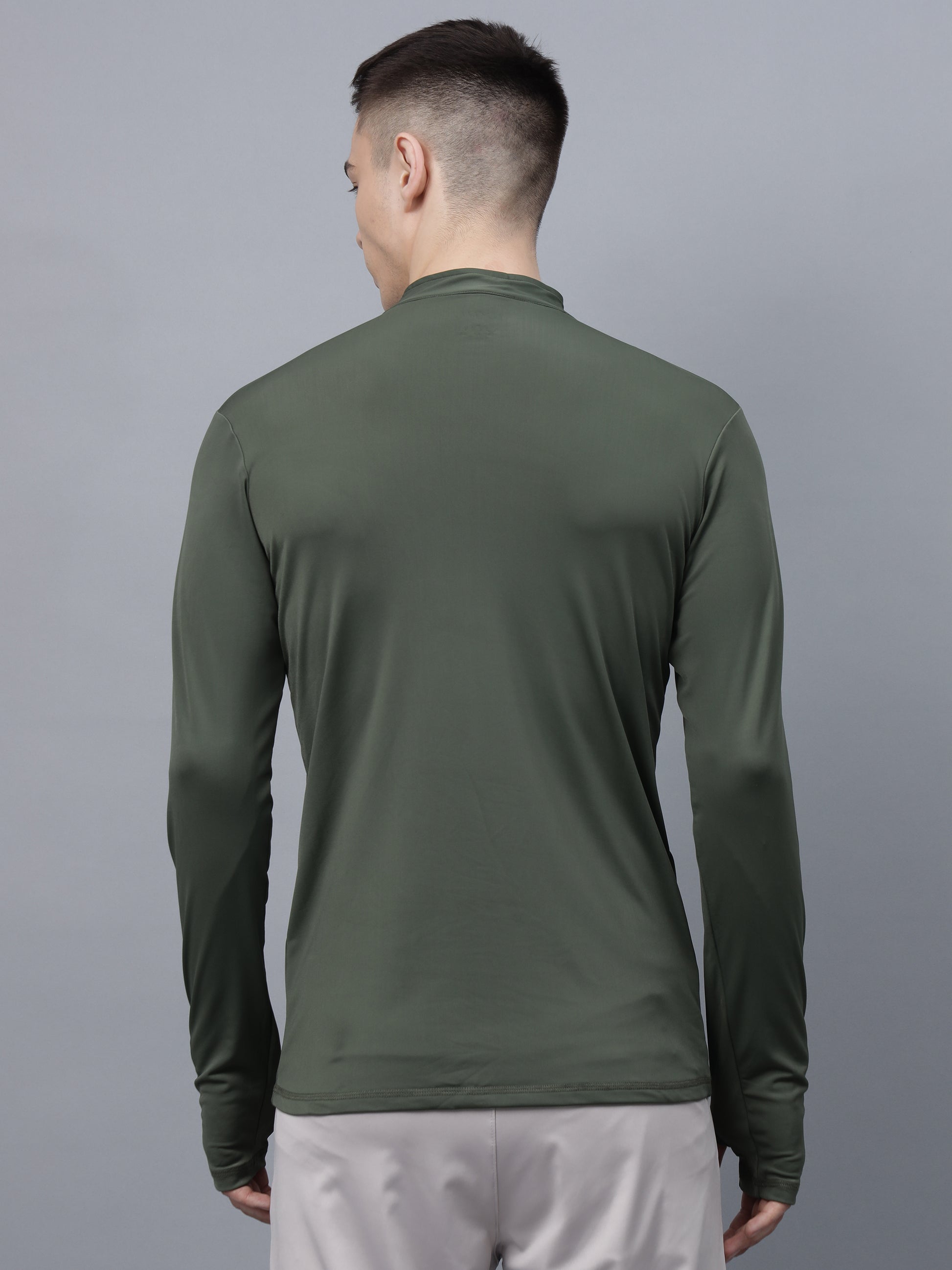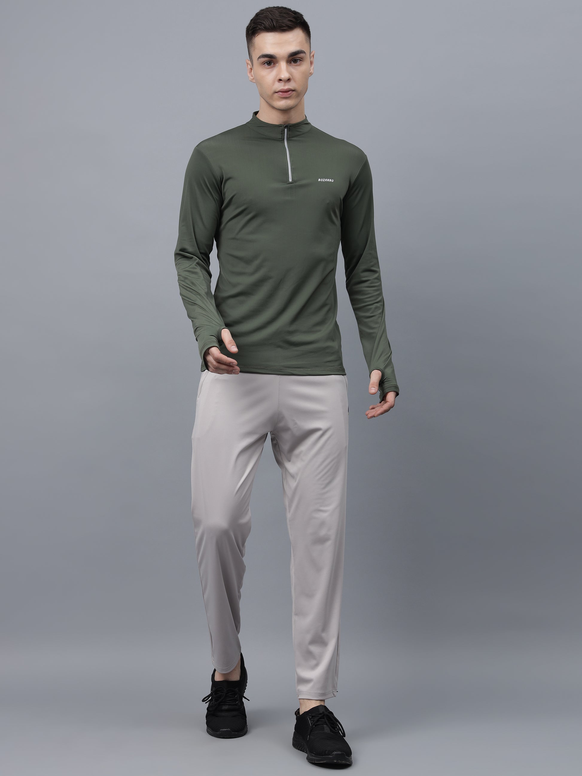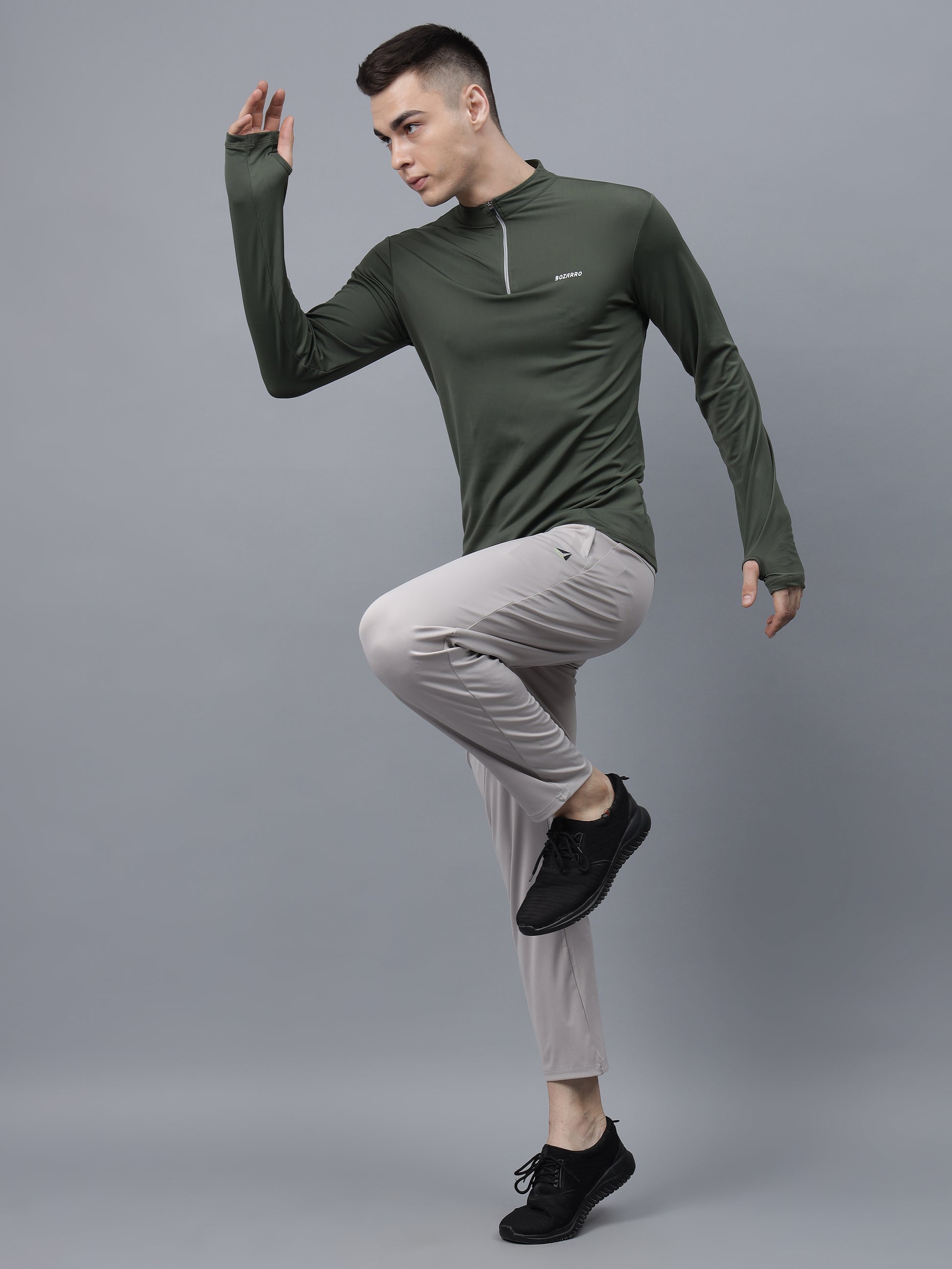 Men's Thumbhole Round Neck Full Sleeve T-Shirt |Half-Zipper Closure | Men's Basic Activewear T-Shirt for Mens-Olive Green